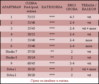 koje se ne naplaćuje. Boravišna pristojba po osobi iznosi 1 €, za osobe do 18 g 0.5 €, djeca ispod 12 godina ne plaćaju boravišnu pristojbu. Iznajmljivanje bicikla za cijeli dan stoji 4,00 €, za sat vremena 1 €. Sezona je od 09.07. do 03.09., podsezona od 29.05 do 09.07 i od 03.09 do 31.09. Za pozive putem telefona odgovaramo na njemačkom, engleskom i hrvatskom. |